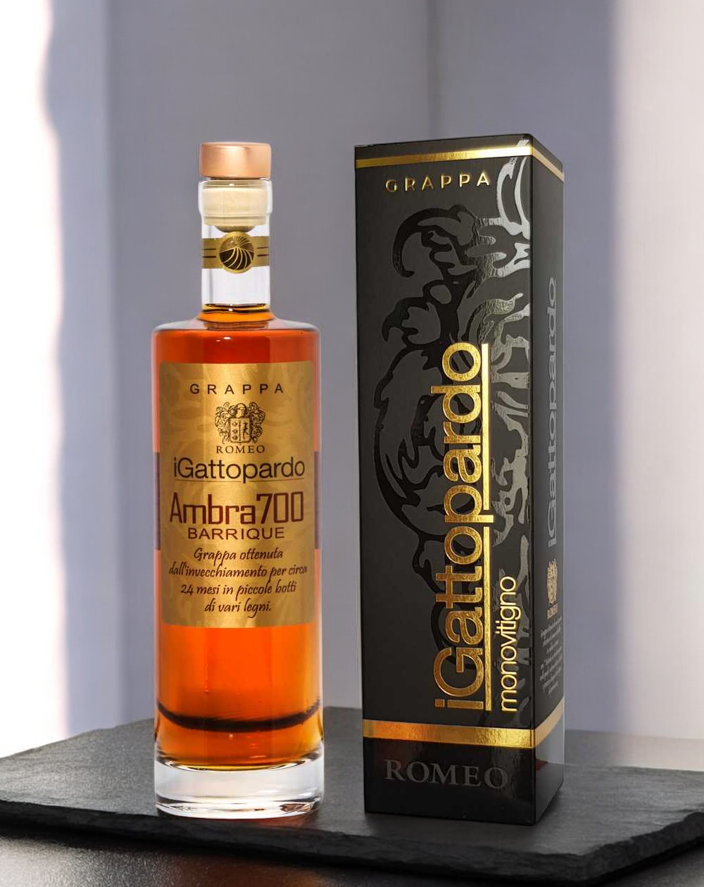 Grappa ottenuta dall’invecchiamento per circa 24 mesi (700 giorni) in piccole botti di vari legni.