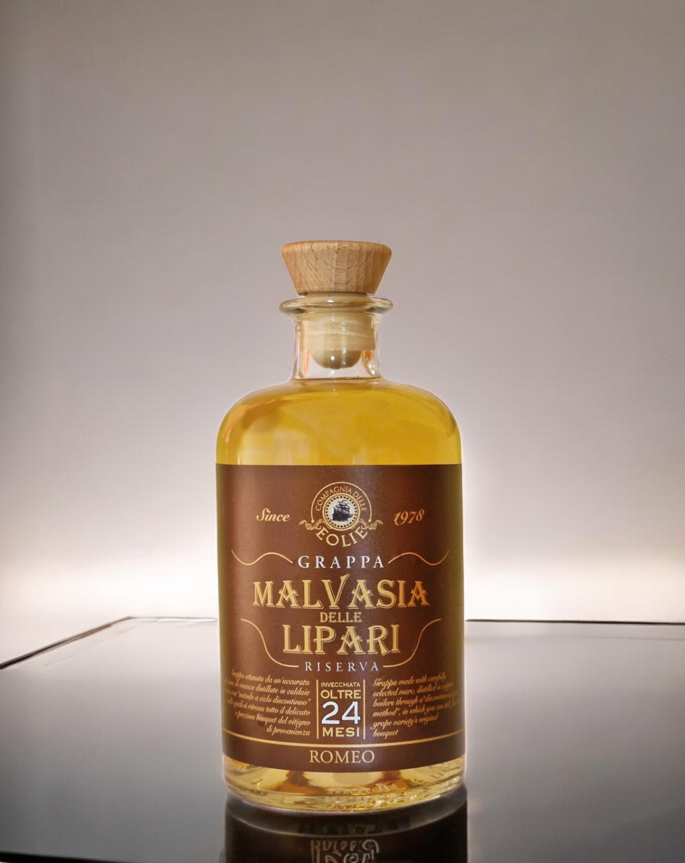 Grappa ottenuta da una accurata selezione di vinacce distillate in caldaie di rame con “Metodo a ciclo discontinuo” nelle quali si ritrova tutto il bouquet del vitigno di provenienza.