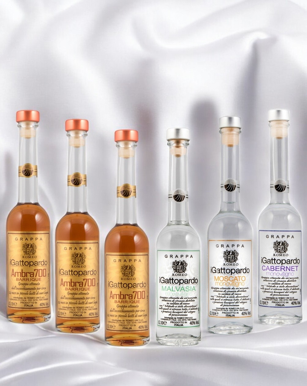Grappa ottenuta da una accurata selezione di vinacce distillate in caldaie di rame con “Metodo a ciclo discontinuo” nelle quali si ritrova tutto il bouquet del vitigno di provenienza.